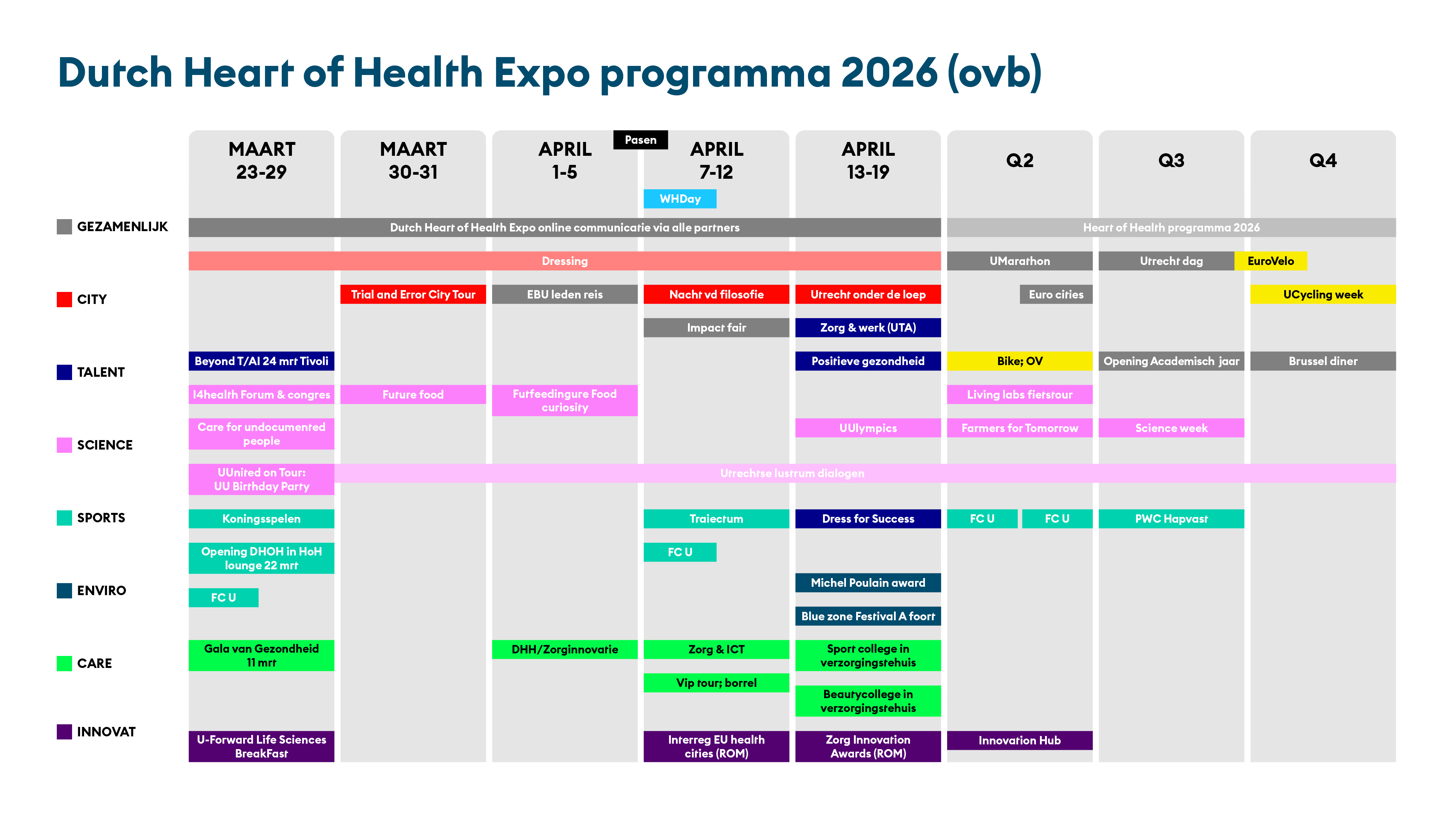 Tijdens de Dutch Heart of Health Expo klopt de regio Utrecht van de activiteiten. Het programma is opgebouwd uit verschillende bijeenkomsten, congressen, presentaties, rondleidingen en tentoonstellingen rondom thema's.